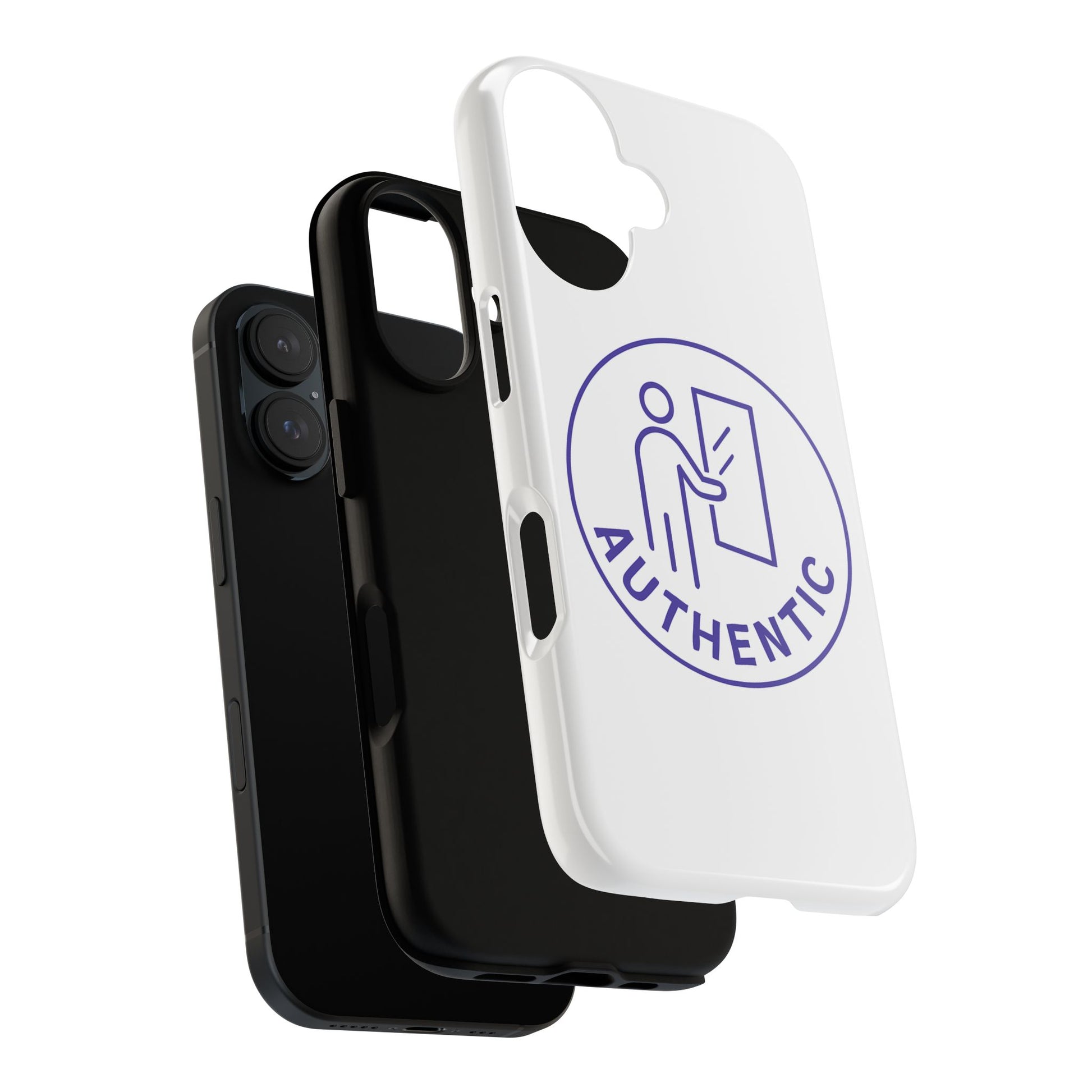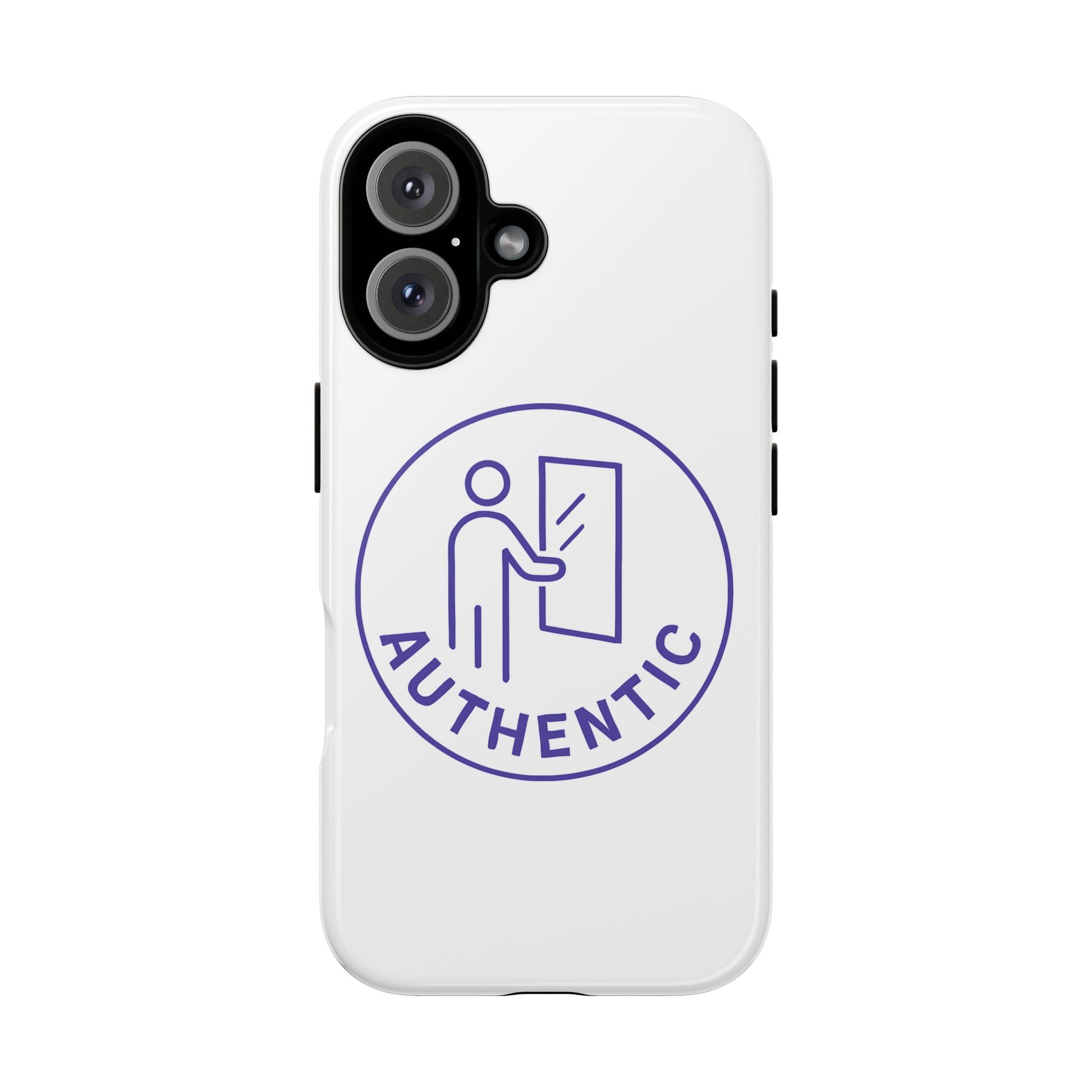 A slim, tough phone case that combines everyday protection with a clean, confident look. The design centers on a minimalist ‘Authentic’ badge — a simple line-illustration figure opening a door — printed with full 3D wrap for continuous coverage and vibrant color. It feels smooth in hand, resists outdoor fading thanks to UV protection, and keeps your phone safe from drops with a dual-layer construction: a hard polycarbonate shell and a shock-absorbing TPU silicone liner. Clear port openings preserve connectivity and wireless charging works without removing the case. This case is built for people who favor understated, honest design and need reliable protection without bulk.