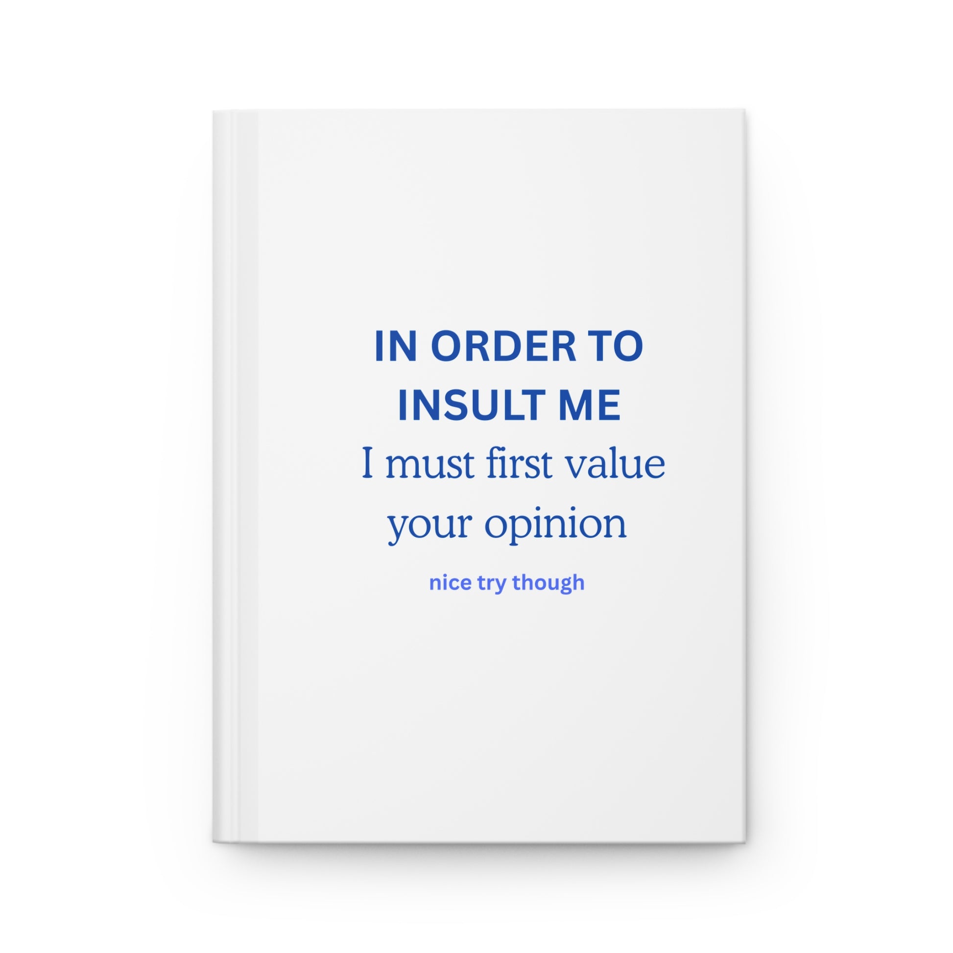 Set boundaries with style using this Hardcover Journal featuring the brilliantly sarcastic message "In Order to Insult Me, I Must First Value Your Opinion." Perfect for anyone who's mastered the art of selective caring.